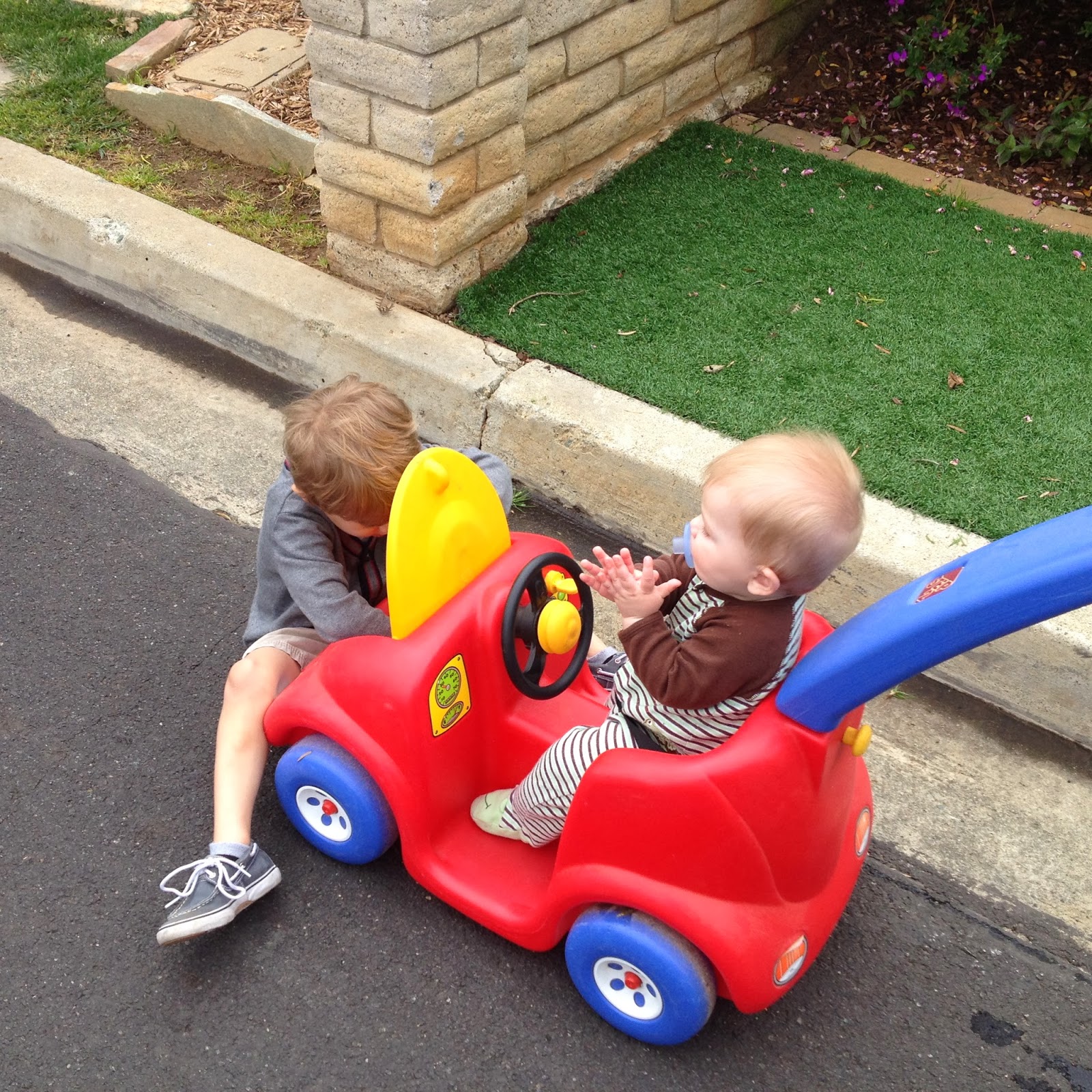 Yesterday we decided to go outside and push Ben around in his car. I would go in a circle and then make a pit stop by Jack and Jack would do a "check-up" on our car to make sure everything was working correctly. He was very thorough in his check-up too; he checked the tires, the engine (which had a bunch of balls and feathers in it and he thought it was funny b/c he would say "here's the problem- there are balls in here!) Ben thought it was the best thing ever. In the third picture you can see Ben clapping for Jack. :)